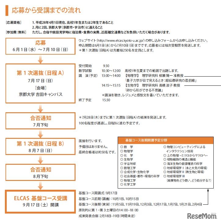 京都大学は、高校1・2年生を対象とした科学講座「グローバルサイエンスキャンパス京都大学ELCAS」の平成28年度基盤コース受講生を募集する。申込期限は7月10日まで。7月17日の試験と8月7日の面接で約50名を選抜する。参加費は無料。