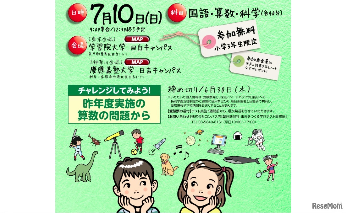 朝日新聞社は、小学3年生を対象とした参加無料のテスト「第6回 未来をつくる学びテスト」を7月10日、学習院大学目白キャンパス(東京)、慶應義塾大学日吉キャンパス(神奈川)にて開催する。事前申込制で、国語・算数・科学の3教科のテストを受けることができる。
