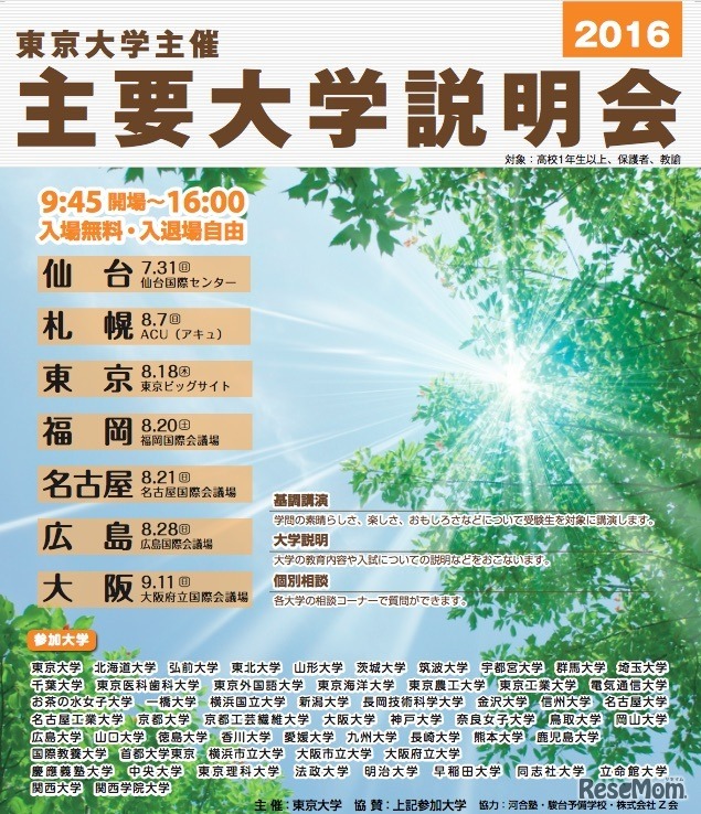 東京大学主催の「主要大学説明会2016」が、仙台・札幌・東京・福岡・名古屋・広島・大阪の全国7都市で7月から9月にかけて開催される。高校生らを対象に基調講演や大学説明会、個別相談などを実施する。参加費無料、事前申込制。