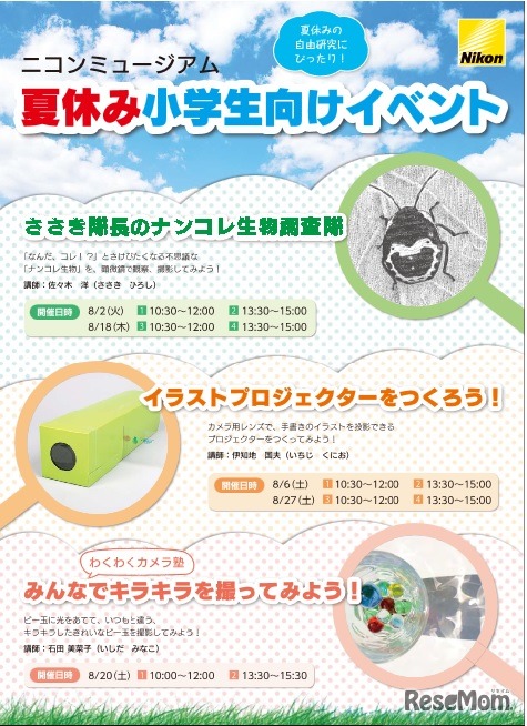 ニコンミュージアムでは、8月に夏休み小学生向けイベントを開催する。生物の撮影やイラストプロジェクターの作成など、楽しみながら学べる体験型イベントで、対象は小学3年~6年生。参加費無料で事前申込が必要。