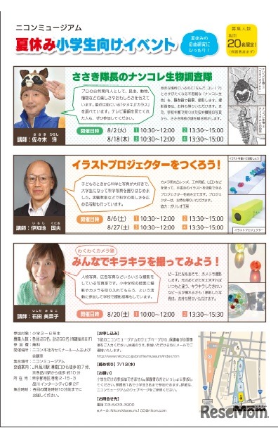 ニコンミュージアムでは、8月に夏休み小学生向けイベントを開催する。生物の撮影やイラストプロジェクターの作成など、楽しみながら学べる体験型イベントで、対象は小学3年~6年生。参加費無料で事前申込が必要。