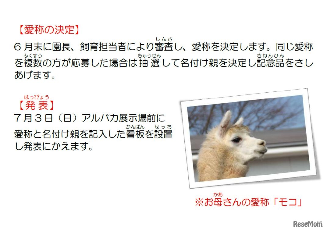 岩手県の盛岡市動物公園では、6月5日に生まれたアルパカのオスの赤ちゃんの愛称を募集している。募集は6月26日まで。応募には、直接来園し、愛称や必要事項を記入した専用の応募用紙を投票箱に投函する。愛称の発表日は7月3日。