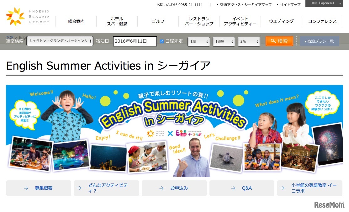 小学館集英社プロダクションは、フェニックスリゾートが運営する宮崎県宮崎市のフェニックス・シーガイア・リゾートのアクティビティー内にて、2泊3日の英語体験学習プログラムを実施する。対象は小学生とその家族で、7月5日まで参加者を募集している。