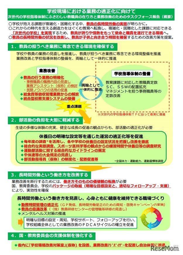 文部科学省は6月13日、教職員の長時間労働是正のための改善策をまとめ公表した。学校給食費などの徴収業務の移管、部活動による負担軽減や休養日の設定などにより、教員が子どもと向き合う時間の確保を推進する。