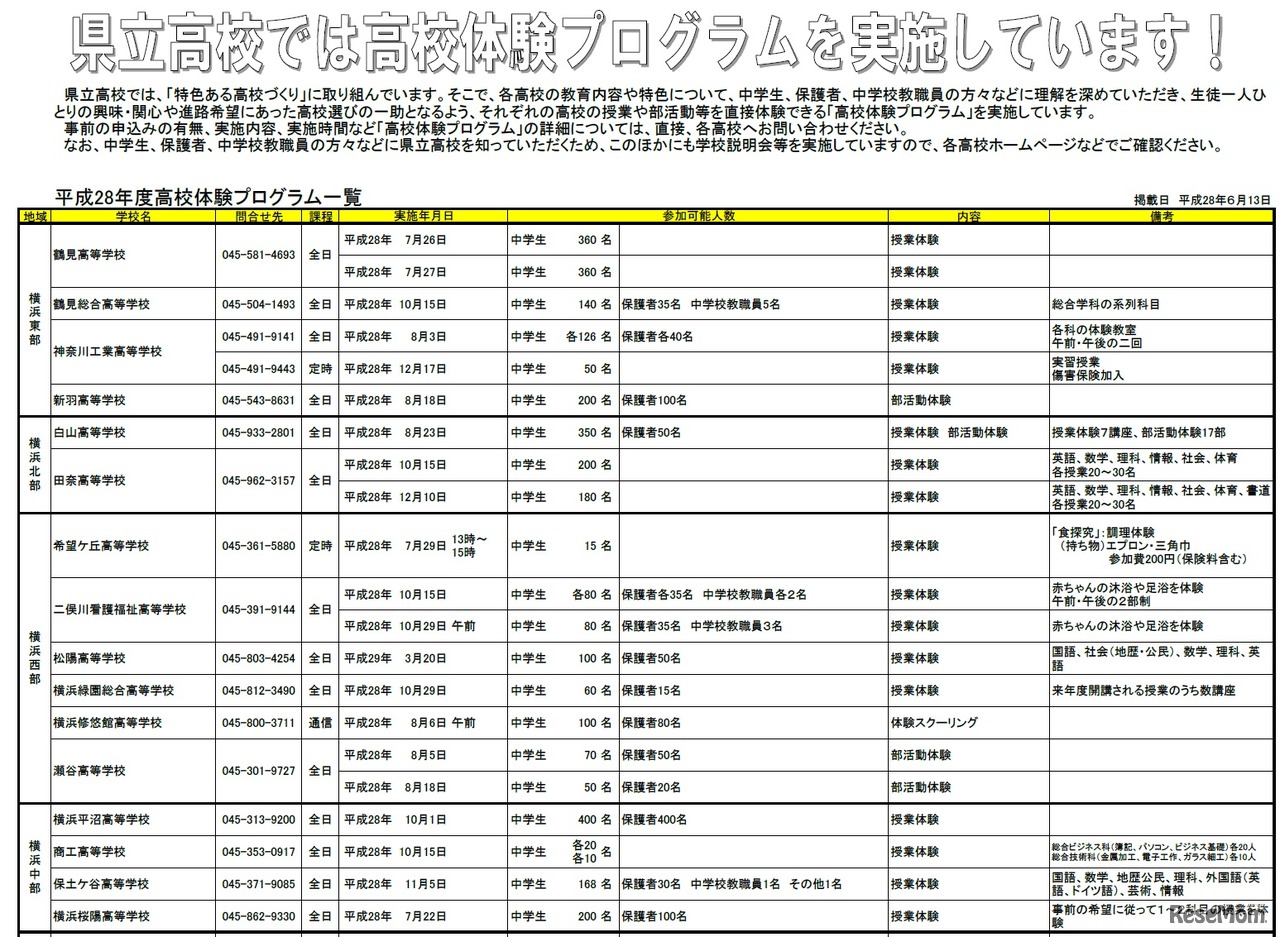 神奈川県は、高校の授業や部活動などを体験できる「県立高校体験プログラム」の実施一覧を発表した。中学生が自分にあった高校選びの手助けになることを目的にしたプログラム。実施日や内容、事前申込みの有無などは各高校で異なる。