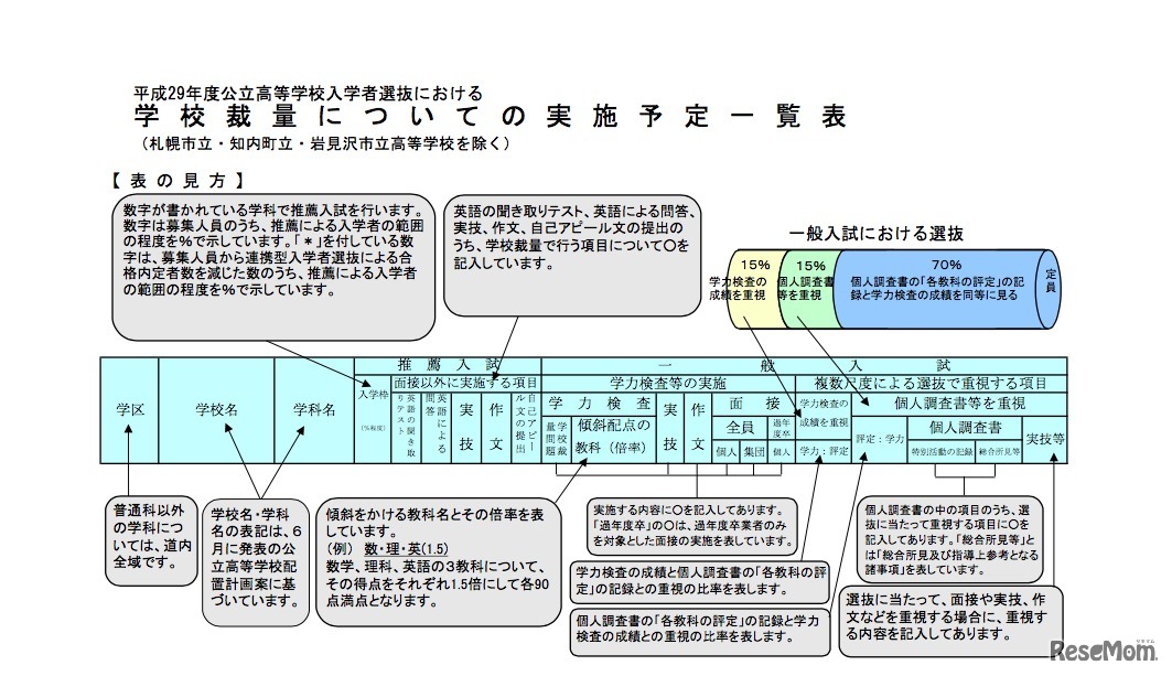 北海道教育委員会は6月13日、平成29(2017)年度北海道公立高等学校入学者選抜における「普通科の推薦要件」と「学校裁量についての実施予定」をホームページに公開した。学力検査で学校裁量問題の実施を予定している学校は37校47学科。普通科で推薦入試実施校は77校。