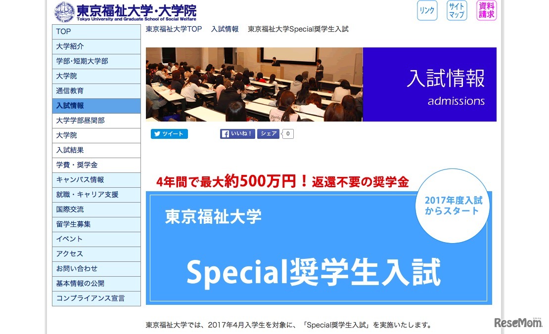 東京福祉大学は、2017年度入試より新たに「Special奨学生入試」を実施すると発表した。東京福祉大学への入学を希望する受験生の経済的支援と優秀な人材確保を目的に新設するもので、合格者には4年間で最大約500万円の返済不要の奨学金を支給する。