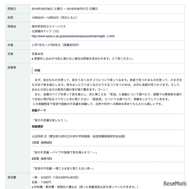 「知的人材ネットワーク・あいんしゅたいん」と京都大学理学部は、親子理科実験教室の夏休み第1弾を8月6日・7日に開催する。科学の授業として定評がある仮説実験授業の研究をもとにした実験で、「音の不思議を楽しもう!」がテーマ。小学生を対象に42名を募集している。