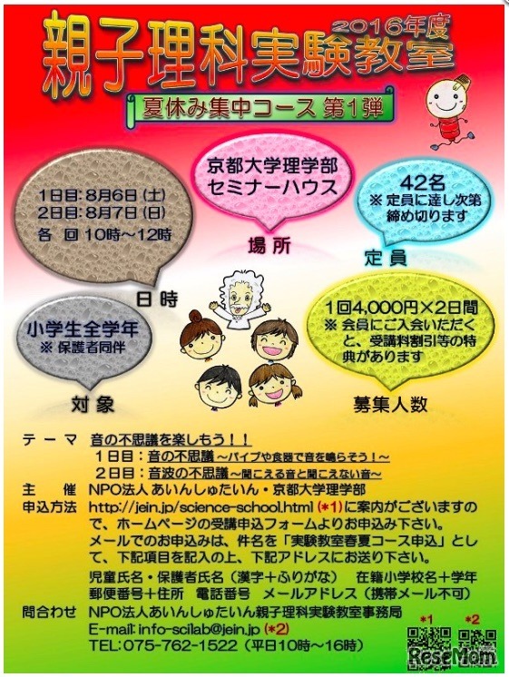 「知的人材ネットワーク・あいんしゅたいん」と京都大学理学部は、親子理科実験教室の夏休み第1弾を8月6日・7日に開催する。科学の授業として定評がある仮説実験授業の研究をもとにした実験で、「音の不思議を楽しもう!」がテーマ。小学生を対象に42名を募集している。
