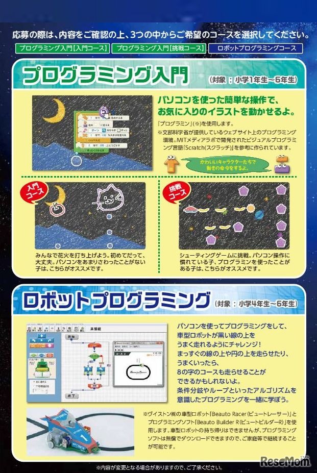 NTTデータは、小学生と保護者を対象としたプログラミング教室を7月30日と31日に開催する。これまでの入門コースと挑戦コースに加え、新たに車型ロボットを動かす「ロボットプログラミングコース」を実施する。いずれも参加費は無料で事前申込みが必要。