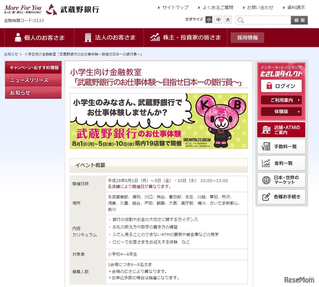 武蔵野銀行は、お金の大切さや銀行の役割などについて学ぶ金融教室「目指せ日本一の銀行員~武蔵野銀行のお仕事体験~」を8月に埼玉県内の19店舗の会場で開催する。対象は地域に住む小学4~6年生。7月1日まで参加を受け付けている。