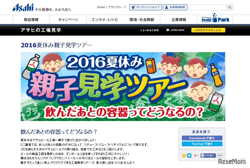 アサヒビールは7月~8月、全国8工場で「夏休み親子見学ツアー ~飲んだあとの容器ってどうなるの?~」を開催する。対象は小学生とその家族。参加費は無料。申込みは、電話もしくはホームページにて先着順で受け付けている。