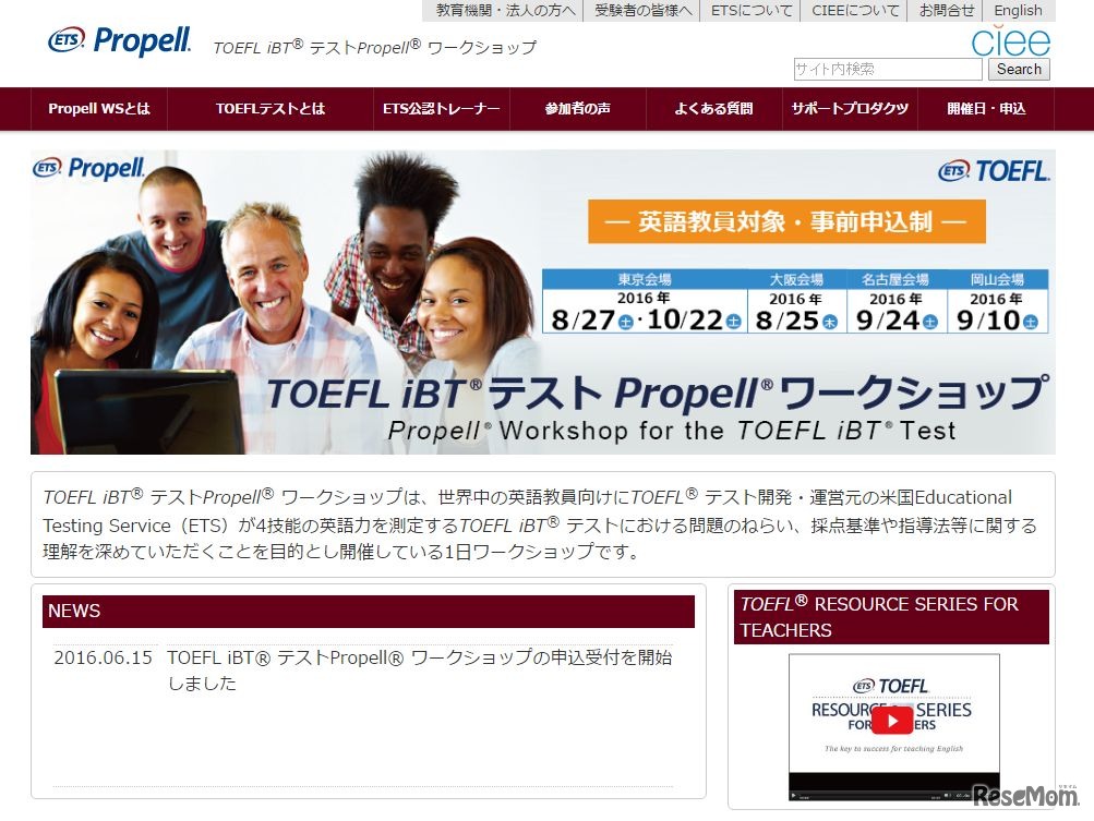 英語教員を対象とした「TOEFL iBTテストPropellワークショップ」が8月25日の大阪会場を皮切りに東京と岡山、名古屋の全国4都市で開催される。参加費は3,000円で、資料や昼食が含まれる。ワークショップは英語で行われる。