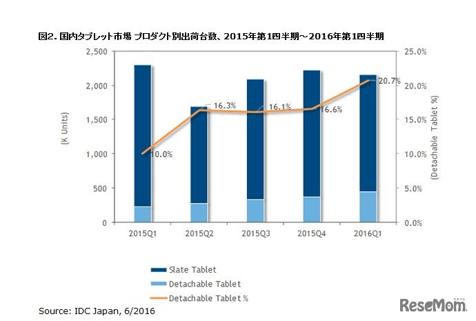 IDC Japanは6月16日、2016年第1四半期(1~3月)の国内タブレット市場実績値を発表した。出荷台数は、前年同期比6.2%減の216万台。ハードウェアキーボードが脱着できるデタッチャブル型タブレットが、前年同期比94.1%増と出荷台数を増やし、出荷比率を2割に伸ばした。