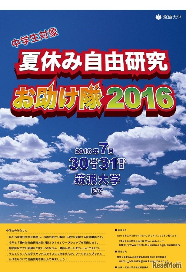 筑波大学は7月30日・31日に、中学生対象の「夏休み自由研究お助け隊」を開催する。参加費は無料。事前に参加するテーマを選んでWebサイトより申し込む。申込み期間は7月1日午前9時~15日午後5時までだが、先着順のため定員に達し次第締め切る。