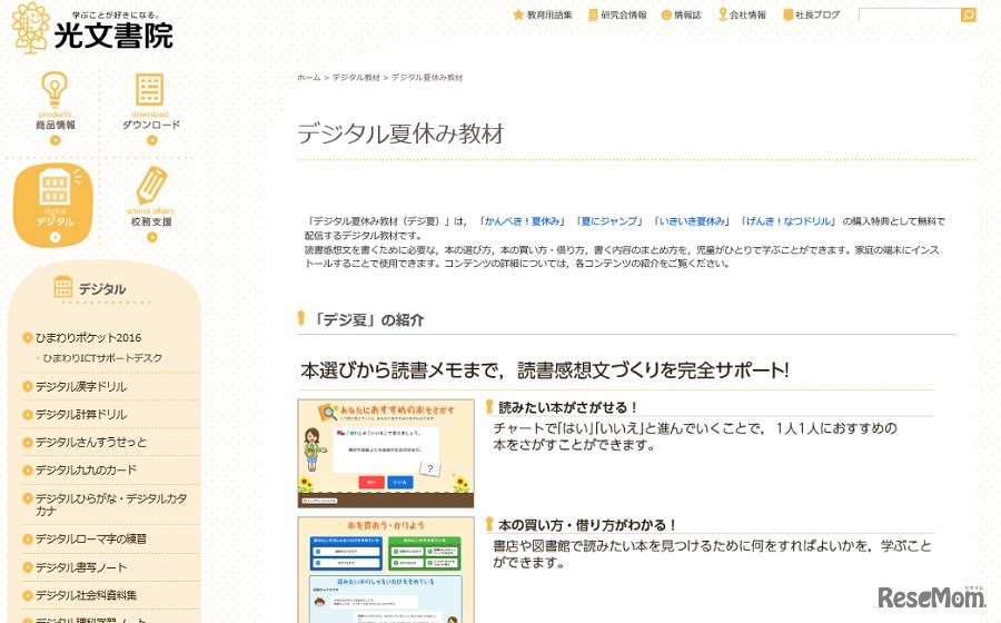 光文書院は、「デジタル夏休み教材(デジ夏)」と「デジタル調べ学習」を公開した。デジ夏は読書感想文づくりをサポートする教材で、本の選び方や買い方・借り方などを子どもにわかりやすく紹介している。
