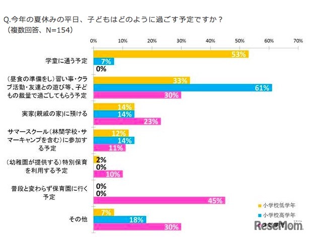 アクトインディが企画運営する子どもとおでかけ情報サイト「いこーよ」が、夏休みの到来を前に「親子の夏休みの過ごし方事情」についてアンケート調査を実施。小学生の平日の過ごし方は、低学年が「学童」、高学年が「自由」に過ごす割合が半数以上を占める結果となった。