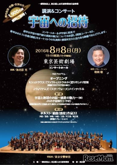 東京都人材支援事業団は、8月8日に東京芸術劇場で開催する講演&コンサート「宇宙への招待」に1,900名を無料招待する。対象は、都内在住・在勤・在学の人。当日は、宇宙航空研究開発機構(JAXA)宇宙飛行士による講演とオーケストラ演奏を楽しむことができる。