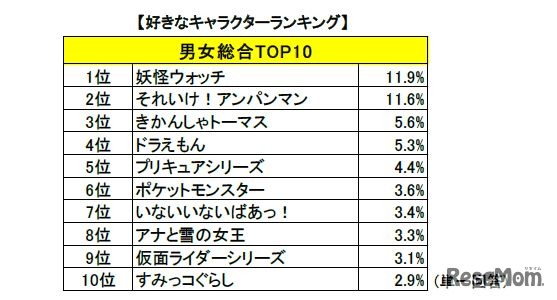 バンダイは6月23日、子どもの好きなキャラクターに関する意識調査の結果を公表した。男女の総合1位は昨年に続き「妖怪ウォッチ」、2位は「それいけ!アンパンマン」。1年間に親がおもちゃ購入に使った平均額は1万円以上であることがわかった。