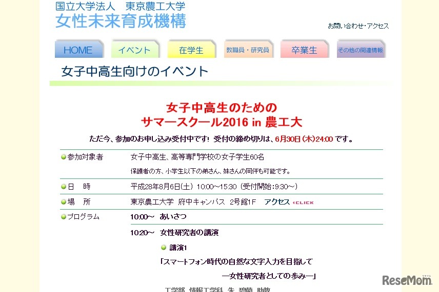 東京農工大学は8月6日、女子中高生や高等専門学校の女子学生を対象とした「女子中高生のためのサマースクール2016 in 農工大」を開催する。定員は60名。申込みは6月30日まで、Webの申込みフォームより受け付けている。