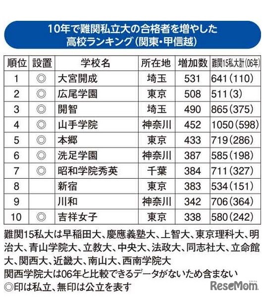 大学通信が運営する携帯サイト「教育総合研究所」は6月23日、「10年で難関私立大の合格者を増やした高校ランキング2016(関東・甲信越編)」を発表した。1位は「大宮開成」、2位は「広尾学園」、3位は「開智」がランクインし、上位10校中8校を私立の中高一貫校が占めた。