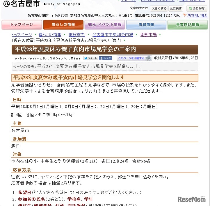 名古屋市の南部市場は、8月に市場の役割をわかりやすく紹介す親子食肉市場見学会を開催する。市内在住の小・中学生とその保護者が対象で、親子2名1組で申し込む。募集は各日とも12組24名で、往復はがきで7月19日までに必着で郵送。