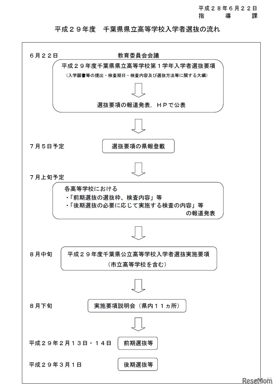 千葉県教育委員会は、6月22日、平成29年度千葉県県立高等学校の入学者選抜要項を発表した。前期選抜は平成29年2月13日と2月14日、後期選抜は平成29年3月1日に実施する。