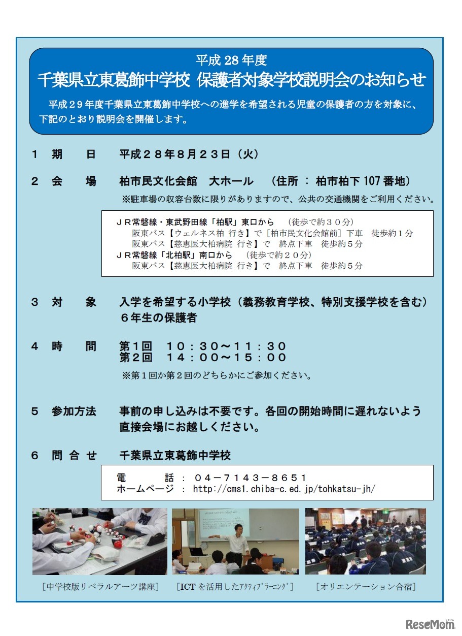 千葉県立東葛飾中学校説明会のお知らせ