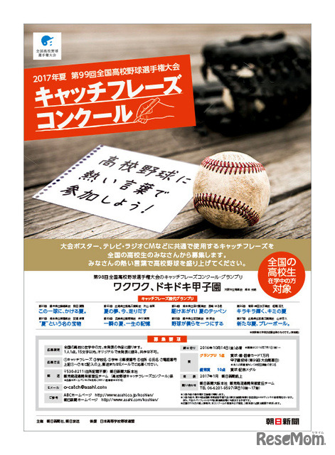 朝日新聞社と朝日放送は、2017年夏に開催する第99回全国高校野球選手権大会のPR用キャッチフレーズを募集する「キャッチフレーズコンクール」を開催すると発表した。応募対象は高校生。7月1日から10月14日まで作品を募集する。