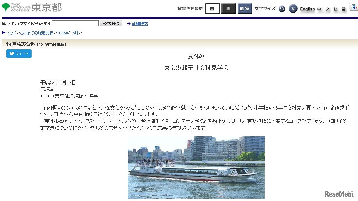 東京都は、夏休み特別企画乗船会「夏休み東京港親子社会科見学会」を、8月11日に開催する。水上バスに乗船し、レインボーブリッジやお台場海浜公園などを見学する。対象は小学校4年生から6年生の親子。参加無料。