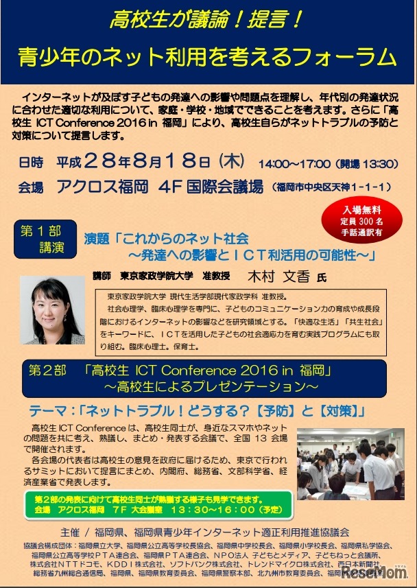 福岡県は8月18日、青少年のインターネット利用を考えるフォーラムを開催する。基調講演のほか、高校生によるネットトラブル防止のプレゼンテーションを実施。参観だけでなく参加の申込みも受け付けている。