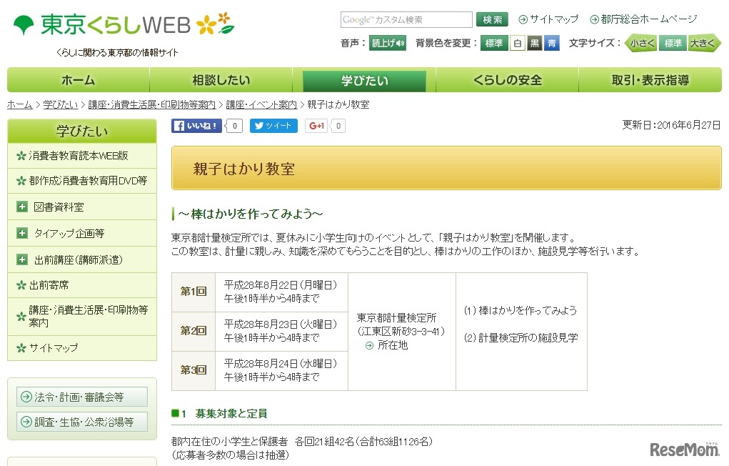 東京都計量検定所では8月22日から24日にかけて、都内小学生親子を対象とした夏休み企画「親子はかり教室」を開催する。棒はかりの工作のほか、施設見学を実施。8月中は特別展示も行う。3日間で63組126名を募集する。