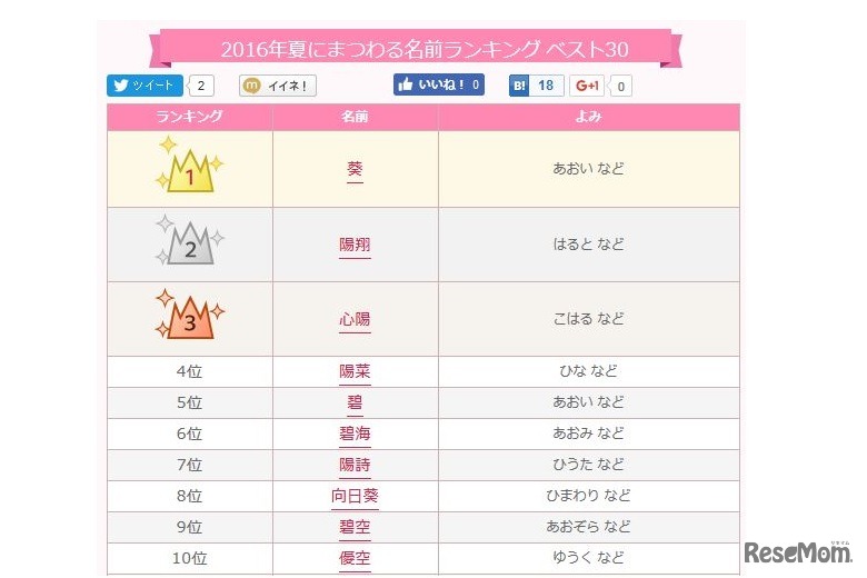 スマートフォン向けアプリ「赤ちゃん名づけ」を提供するリクルーティングスタジオは、「2016年夏にまつわる名前ランキング」を発表した。1位は「葵」、2位は「陽翔」、3位は「心陽」が選ばれた。「陽」の漢字を用いた名前が人気で、トップ30のうち13を占めた。