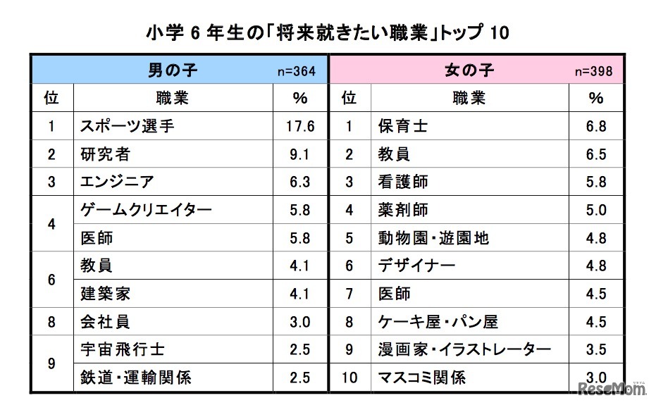クラレが6月28日、小学6年生の「将来就きたい職業」、親の「就かせたい職業」ランキングを発表した。小学6年生男子の1位は「スポーツ選手」、女子は「保育士」。ランキングでは、小学校入学時の就きたい職業と比較し、入学時から6年間での変化も追っている。