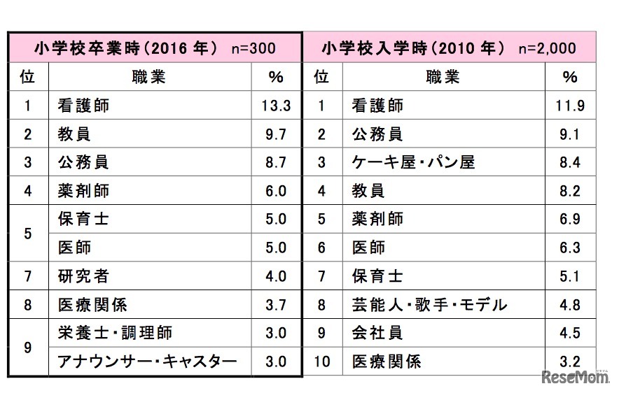 クラレが6月28日、小学6年生の「将来就きたい職業」、親の「就かせたい職業」ランキングを発表した。小学6年生男子の1位は「スポーツ選手」、女子は「保育士」。ランキングでは、小学校入学時の就きたい職業と比較し、入学時から6年間での変化も追っている。