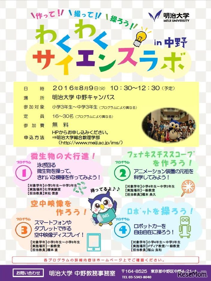 明治大学総合理数学部は、小学生と中学生を対象にした「わくわくサイエンスラボin中野」を8月9日に中野キャンパスで開催する。「工作」や「実験」を通して科学の新しい発見や感動を体験するイベント。参加は無料で、申込みは7月8日まで。