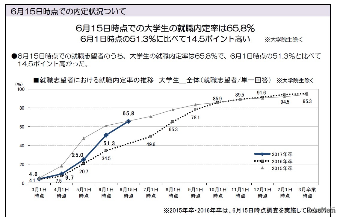 リクルートキャリアの研究機関、就職みらい研究所の調査によると、6月15日時点での大学生の就職内定率は65.8%で、6月1日時点の就職内定率の51.3%と比べて、14.5ポイント高い結果だった。