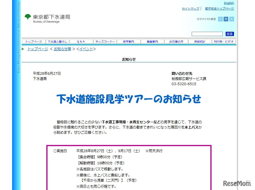 東京都下水道局は、「下水道施設見学ツアー」を、8月27日と9月17日に実施する。下水道工事現場や水再生センターなどを見学したあと、水上バスに乗船し、下水道の働きできれいになった川を見る。対象は都内在住の小・中学生とその保護者。