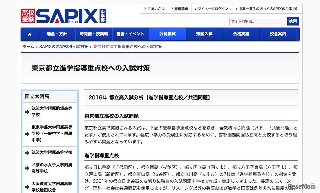 難関高校の進学指導塾SAPIX中学部では、主要高校への合格に向けて志望校別の入試対策をまとめており、都立高校においてもトップ校である「進学指導重点校」の入試対策を掲載している。2016年度入試分析結果をもとに、入試の仕組みや各教科の傾向をまとめている。