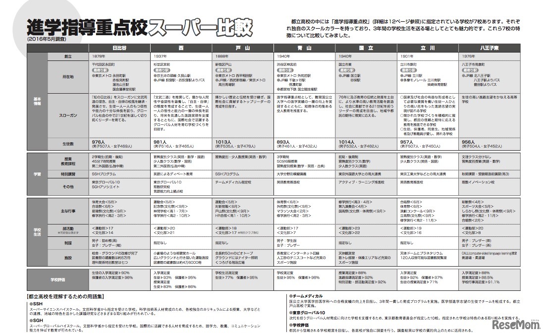 難関高校の進学指導塾SAPIX中学部では、主要高校への合格に向けて志望校別の入試対策をまとめており、都立高校においてもトップ校である「進学指導重点校」の入試対策を掲載している。2016年度入試分析結果をもとに、入試の仕組みや各教科の傾向をまとめている。