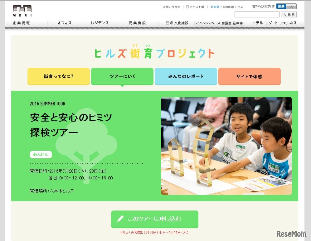 森ビルは7月28日より8月27日まで、楽しみながら学びを見つける子ども向け体験プログラム「ヒルズ街育プロジェクト」を開催する。生きた街を教材とした全6種類44回のツアーを行う。すべてのツアーは参加費無料で、事前申込みが必要。