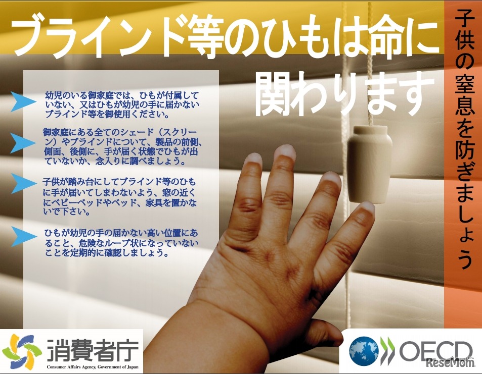 ブラインドやスクリーンのひも部分、カーテン留めなどのひも状部分が、子どもの首に絡まり「ヒヤッ」としたことはないだろうか。消費者庁は6月30日、「子ども安全メール from 消費者庁」でブラインドなどのひもによる事故に関し、注意を促した。