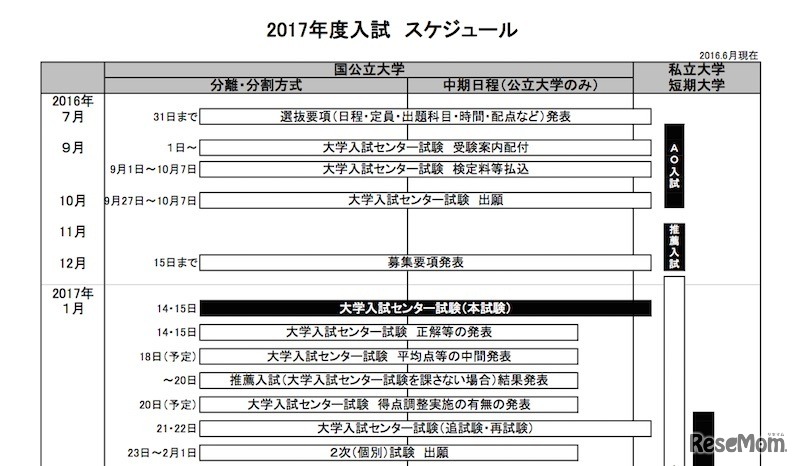 河合塾の大学入試情報サイト「Kei-Net」は、6月現在の2017年度「大学入試全体スケジュール」を掲載した。2016年7月頃に各大学が行う日程・定員・出題科目などの選抜要項発表から、2017年4月のセンター試験成績の本人開示までの日程をまとめている。