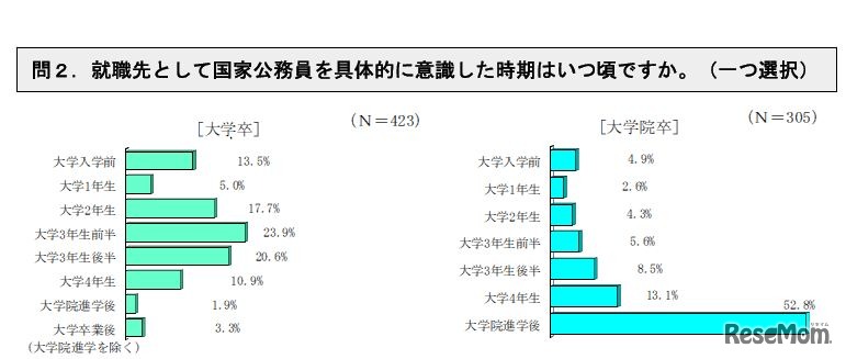 国家公務員採用総合職試験に合格して採用された新人職員を対象としたアンケート結果によると、就職先として国家公務員を具体的に意識した時期は、大卒者の約6割が3年生以降であることがわかった。近年、少しずつ遅くなっている傾向にあるという。