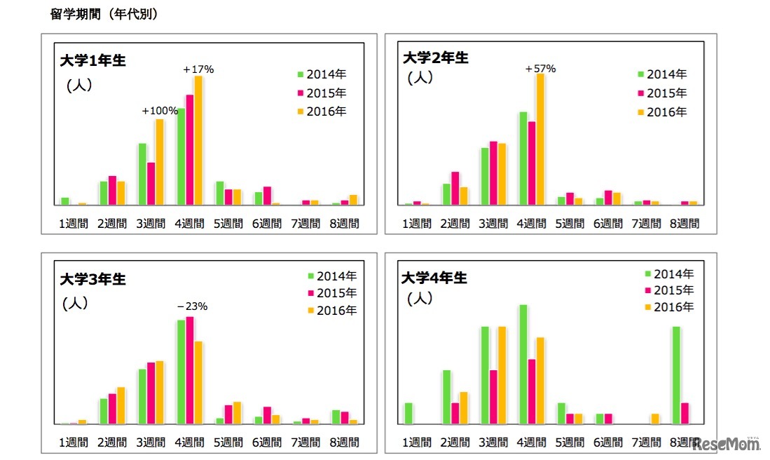 留学ジャーナルは6月30日、今夏の留学申込み動向と意識調査をまとめた「2016年夏休み留学動向」を発表した。大学生の夏休みの留学予定者は10年連続で増加、過去10年で最多となる見込み。学年別では2年次の1か月留学が主流になりつつあるという。
