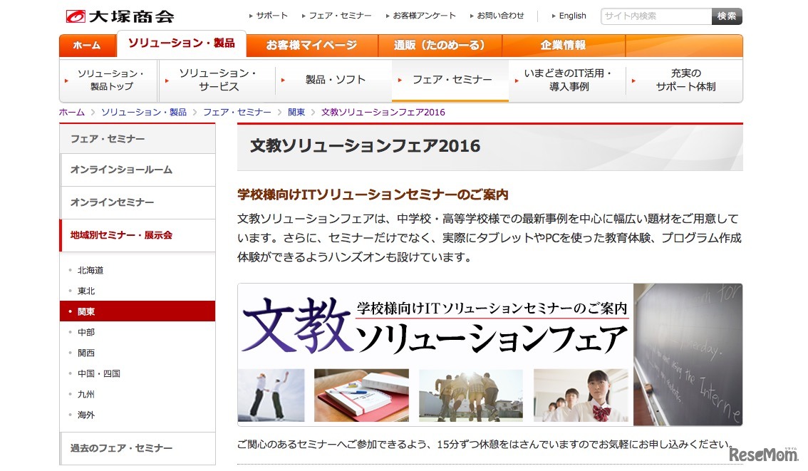 大塚商会は8月3日、学校向けのITソリューションを紹介するセミナーや参加体験、企業による展示を行う「文教ソリューションフェア2016」を東京都千代田区の大塚商会本社ビルで開催する。対象は学校教員や教育関係者。参加無料で、事前予約制。