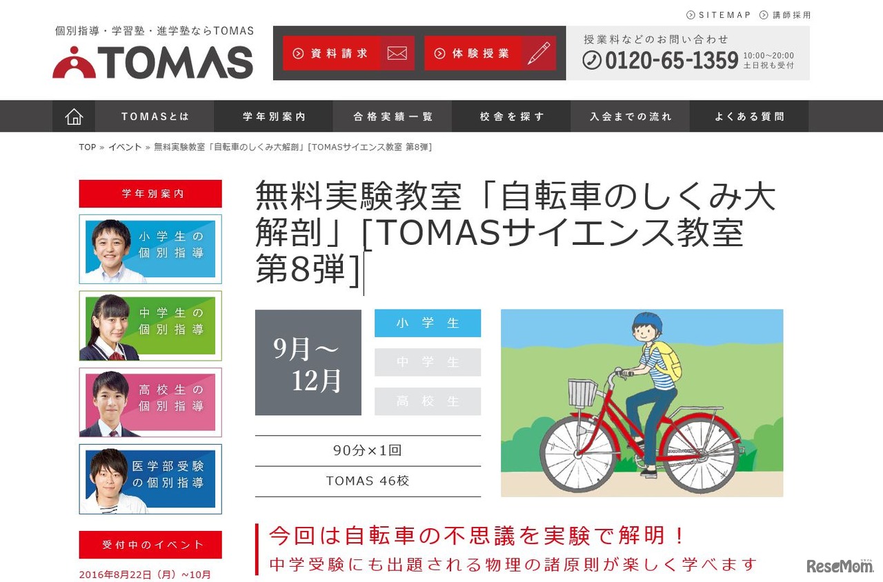 TOMASサイエンス教室は、中学受験にも役立つという実験イベント「TOMASサイエンス教室」の第8弾「自転車のしくみ大解剖」を、9月1日から12月23日まで首都圏近郊のTOMAS46校にて順次開催する。各校舎とも先着30名の無料開催。
