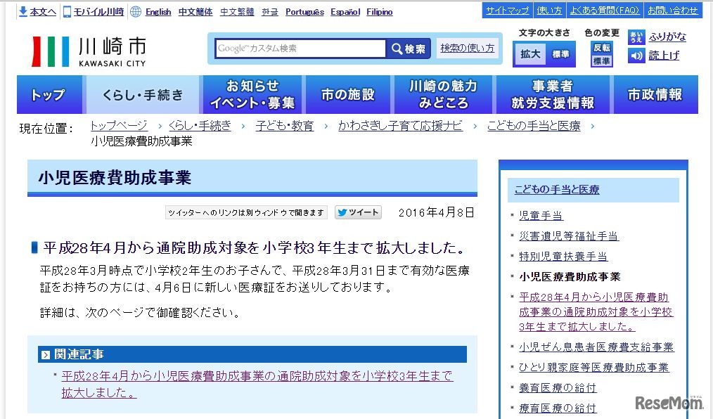 全国で子どもの医療費に対する助成対象を拡大する動きがみられる。横浜市は平成27年10月より通院助成の対象を小学1年生から小学3年生までに拡大、川崎市も4月より小学3年生までに拡大した。また、福岡市では、10月より小学6年生までに拡大する。