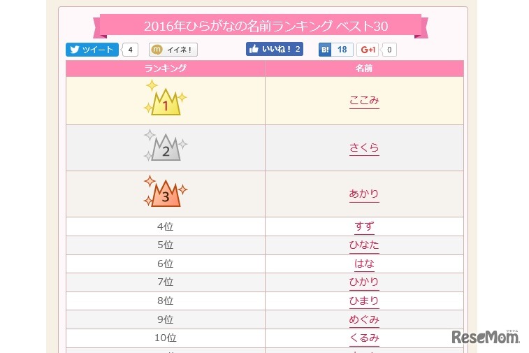 スマートフォン向けアプリ「赤ちゃん名づけ」を提供するリクルーティングスタジオは、「2016年ひらがなの名前ランキング」を発表した。1位は「ここみ」、2位は「さくら」、3位は「あかり」がランクインした。
