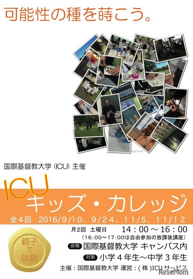 国際基督教大学(ICU)は、小学4年生から中学3年生と保護者を対象とした「ICUキッズ・カレッジ2016 秋講座」を9月と11月に開催する。参加費は各回5,000円(税込・損害保険込)。定員は各回10組20名から20組40名までとなっており、先着順で受け付ける。